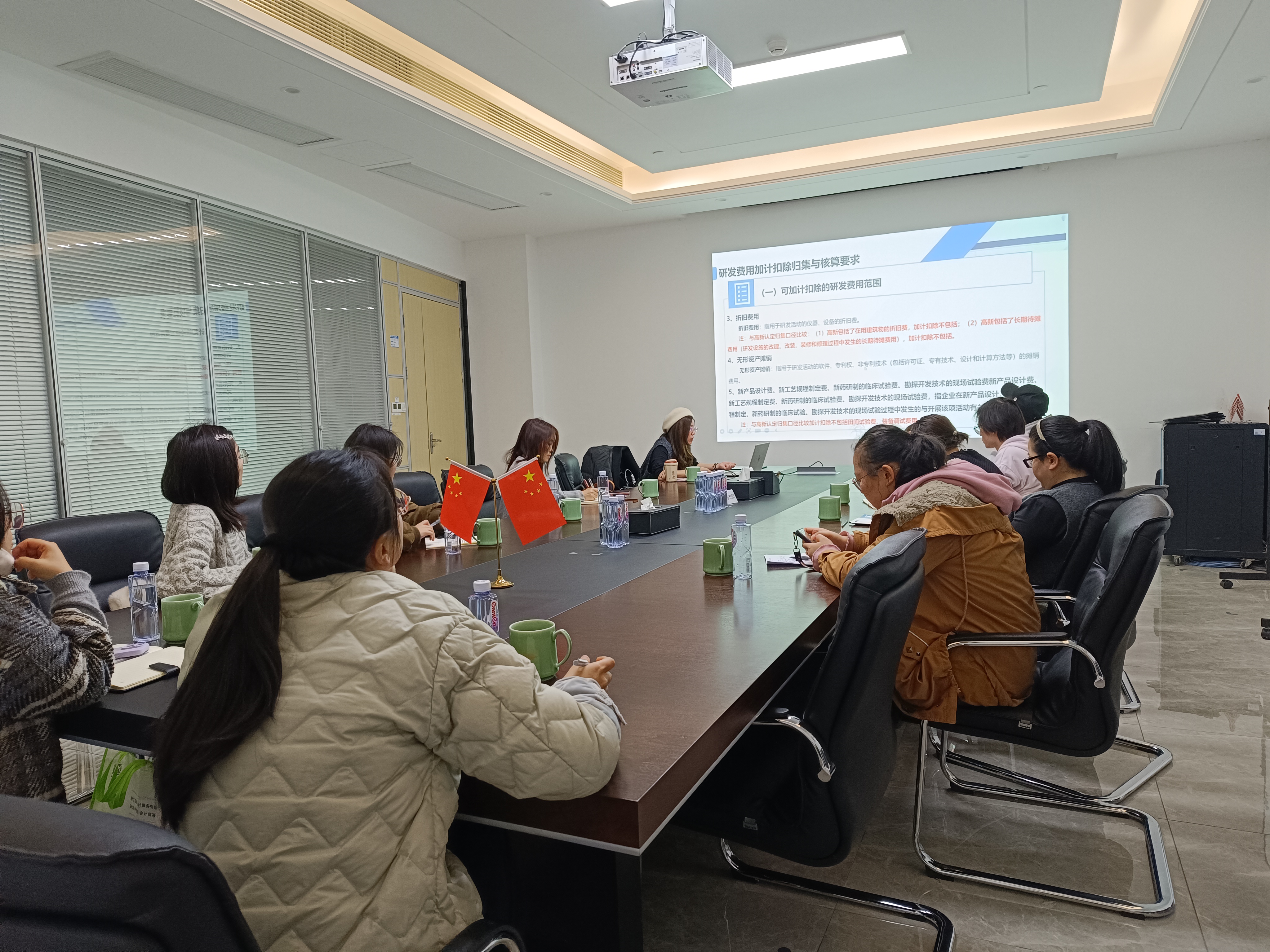 培训在园区会议室内举行,现场座无虚席,来自不同行业的企业代表们齐聚一堂,共同汲取知识养分。姚老师以其丰富的专业知识和实践经验,从研发费用加计扣除政策概述、研发费用加计扣除归集和核算要求、研发费用加计扣除注意要点、研发费用加计扣除留存备查及后续管理等方面为大家进行讲解。